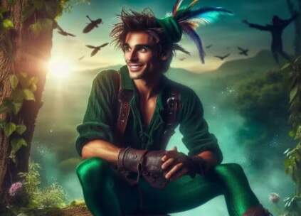 Nesta nova versão de Peter Pan feita pela inteligência artificial, o personagem de JM Barrie aparece em seu habitat, Neverland, terras mágicas onde, como afirmou seu autor, “as crianças sempre chegam com seus barcos quando brincam”. O jovem Peter Pan está sentado em um tronco, sorrindo e olhando para o lado da imagem. Atrás dele voa um bando de pássaros com um amplo vale sobre o qual o sol nasce.