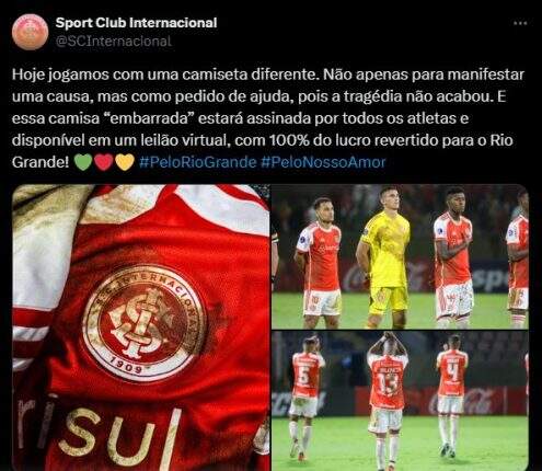 “Hoje jogamos com uma camiseta diferente. Não apenas para manifestar uma causa, mas como pedido de ajuda, pois a tragédia não acabou. E essa camisa ‘embarrada’ estará assinada por todos os atletas e disponível em um leilão virtual, com 100% do lucro revertido para o Rio Grande”, anunciou o clube.