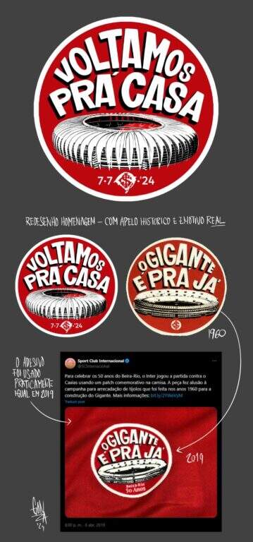 No domingo, o uniforme dos jogadores colorados carregará um patch comemorativo à volta do Inter para casa. Criada pelo artista Gonza Rodríguez, a peça é uma releitura do selo “O Gigante é pra já”, lançado pelo clube na década de 1960, com o objetivo de engajar a torcida nas obras de construção do Beira-Rio na época. Posteriormente, as camisas da partida contra o Vasco serão leiloadas na plataforma Match Worn Shirt.