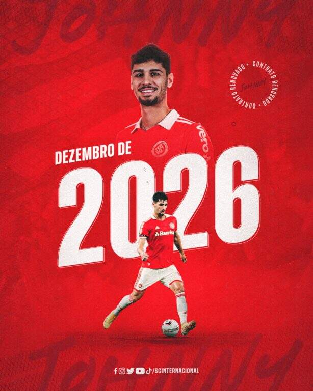 O Inter anunciou na tarde desta quarta-feira (15) a renovação do contrato de Johnny. O volante de 21 anos ampliou seu vínculo com o clube até dezembro de 2026. Destaque da base do Inter e com convocação para a seleção dos Estados Unidos no currículo, Johnny estreou como profissional do clube em 2020, quando tinha 17 anos.