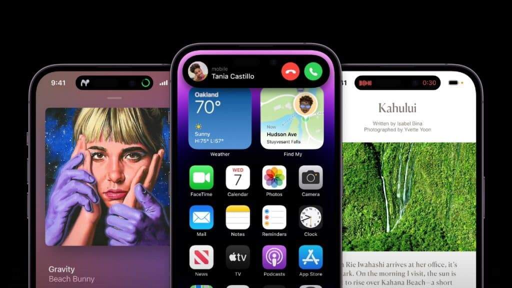 A Apple reduziu o recorte na tela dos novos iPhone 14 Pro e iPhone 14 Pro Max, naquela apontada como a maior mudança visual em anos. O antigo entalhe retangular saiu de cena para dar lugar a um novo desenho em formato de pílula que é 30% menor que o do iPhone 13. Com a mudança, a gigante de Cupertino também implementou o Dynamic Island. O recurso insere animações que dão a ideia de continuidade durante a execução de aplicativos de música, mapas, ligação e de redes sociais, por exemplo.