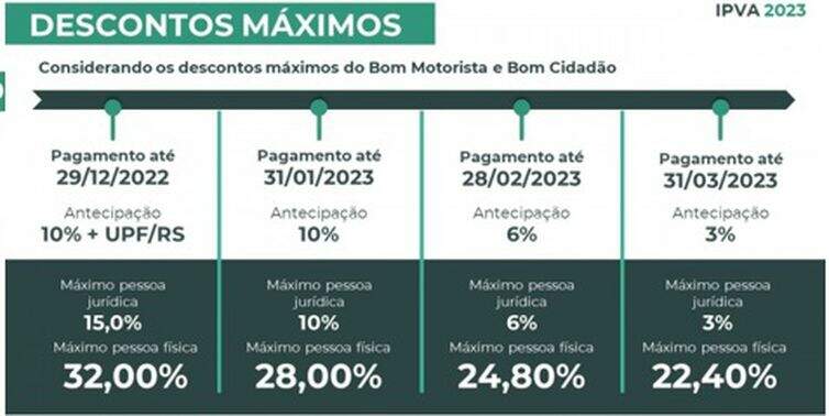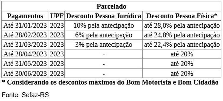 Segundo a Secretaria de Fazenda gaúcha, a quitação em cota única nos meses de janeiro, fevereiro e março terão descontos de 10%, 6% e 3% respectivamente. O desconto também será aplicado para que, ao parcelar, pagar antecipadamente.