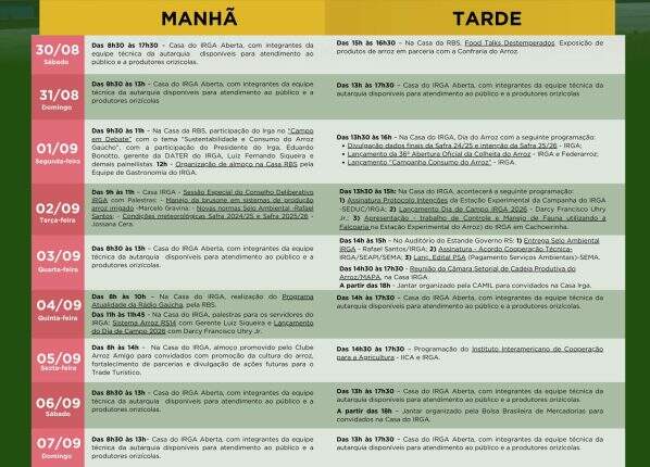 Na programação, estão previstas reuniões com entidades do setor e produtores rurais. Na segunda-feira (1º/9), é o Dia do Arroz. Na agenda, a partir das 13h30min, ocorre a divulgação dos dados oficiais da Safra 2024/2025 e a intenção da safra 2025/2026, o lançamento da 36ª Abertura Oficial da Colheita do Arroz em conjunto com a Federarroz e o lançamento da campanha nacional “Consumo de Arroz”, uma iniciativa do Irga e de entidades parceiras. O objetivo da campanha é ampliar o mercado consumidor do arroz produzido no Rio Grande do Sul para outros estados brasileiros.