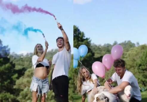 Ela e o namorado, Rodrigo Calazans, receberam a notícia com ajuda de seus cachorros, que apareceram correndo com bexigas em rosa e azul. Depois, o casal acendeu alguns sinalizadores de fumaça também nas cores para fazer o registro.