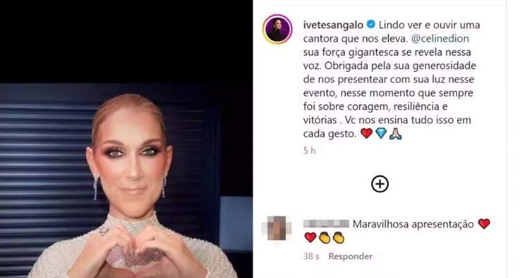 “Lindo ver e ouvir uma cantora que nos eleva. Céline Dion sua força gigantesca se revela nessa voz. Obrigada pela sua generosidade de nos presentear com sua luz nesse evento, nesse momento que sempre foi sobre coragem, resiliência e vitórias. Você nos ensina tudo isso em cada gesto”, elogiou Ivete Sangalo.