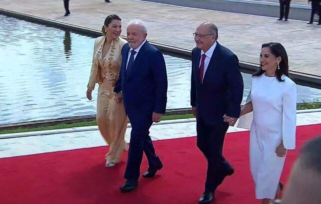 A primeira-dama Janja Lula da Silva surgiu com um terninho champanhe feito pela estilista Helô Rocha, em parceria com bordadeiras do Timbaúba, durante a posse do marido, o presidente Lula, neste domingo (1º), em Brasília. No Rolls Royce presidencial, ela aparece com look bordado ao lado do marido e do vice-presidente, Geraldo Alckmin, e a mulher dele, Lu Alckmin.