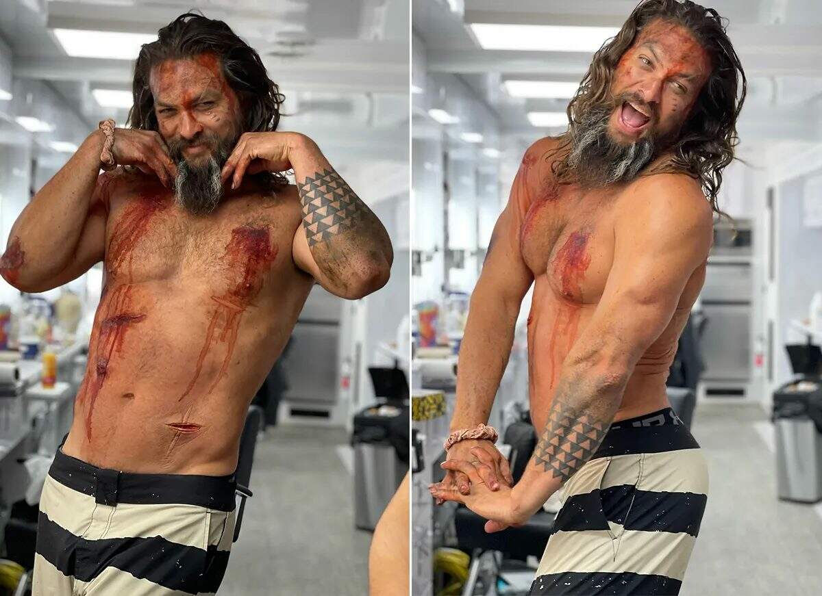 Jason Momoa mostrou seu bom humor ao fazer charme enquanto estava com maquiagem de ferimentos e sangramentos para gravação da série See, disponível na AppleTV+, do qual ele é o protagonista.