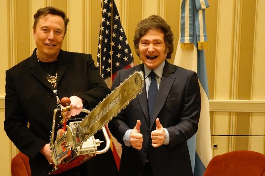 “Chegou a motosserra à DOGE…!!!”, escreveu Milei na rede social X, referindo-se a uma comissão de corte de gastos públicos federais (Department of Government Efficiency, na sigla em inglês), criada por Trump e liderada por Musk.