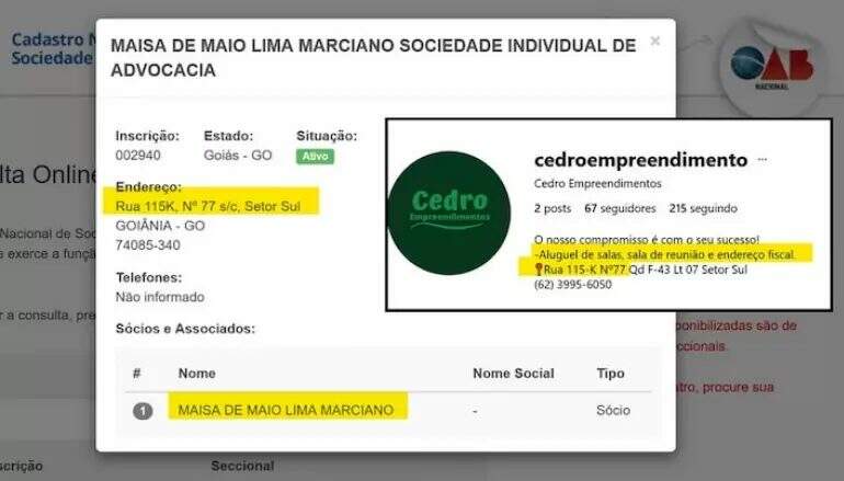 O escritório da advogada Maísa de Maio Marciano tem endereço, conforme registrado no cadastro nacional da Ordem dos Advogados do Brasil (OAB), em uma sala compartilhada do bairro Setor Sul da capital goiana. Na internet, o espaço diz oferecer serviços de aluguel de salas, sala de reunião e endereço fiscal.