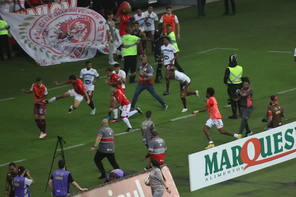 O volante Baralhas também participou da briga dando chutes e voadoras em um dos jogadores do time de Caxias. A confusão envolveu empurrões, socos, voadoras e pontapés.