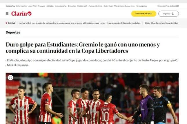 Jornal Clarín destaca derrota do Estudiantes para o Grêmio como “duro golpe” (Foto: Reprodução)