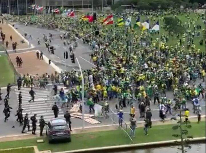 As imagens mostram o prédio do Itamaraty ao fundo, e o instante em que conseguem avançar sem encontrar resistência das forças de segurança. As barreiras são arremessadas, enquanto alguns agentes de segurança recuam e outros permanecem observando a cena em um canteiro.