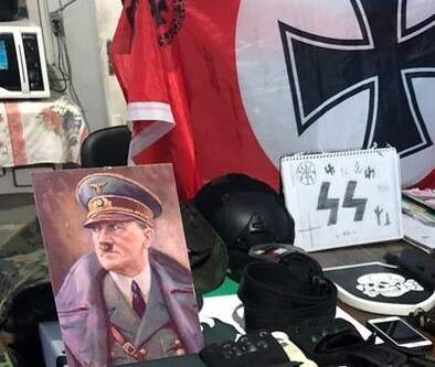Durante o cumprimento de mandado de busca e apreensão na casa onde o adolescente mora com os pais, na noite de terça, a Polícia Civil e a Brigada Militar recolheram um simulacro de arma de fogo, facas, fardas camufladas, fotos de Adolf Hitler e Benito Mussolini e bandeiras nazistas e fascistas. O pai e a mãe foram presos por apologia ao nazismo.