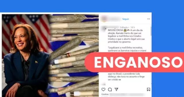 Estão compartilhando na internet que a candidata democrata à presidência nos Estados Unidos, Kamala Harris, prometeu a um dia da eleição que vai legalizar a maconha e que o aborto legal será sua prioridade no governo. Um dos posts com essa alegação afirma que ela teria feito a promessa ao perceber que “está perdendo feio nas pesquisas”.