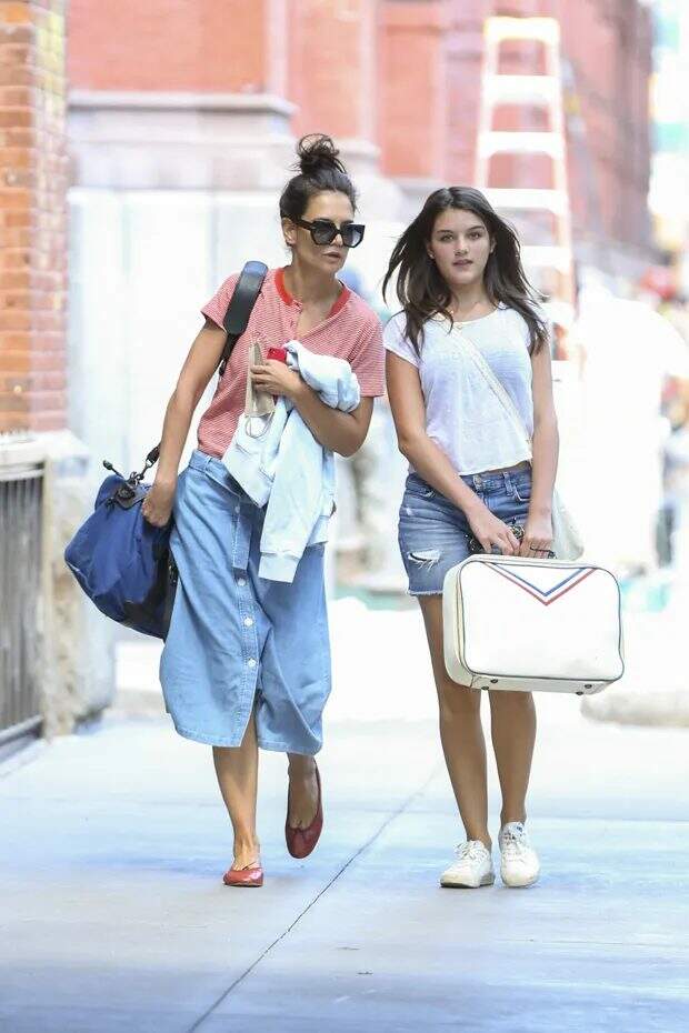 Katie Holmes, de 43 anos de idade, e a filha, Suri Cruise, de 16 anos, foram fotografadas pelas ruas de Nova York, nos Estados Unidos. As imagens, divulgadas nesta segunda-feira (05) pela agência internacional The Grosby Group, mostram a dupla caminhando na cidade com malas.