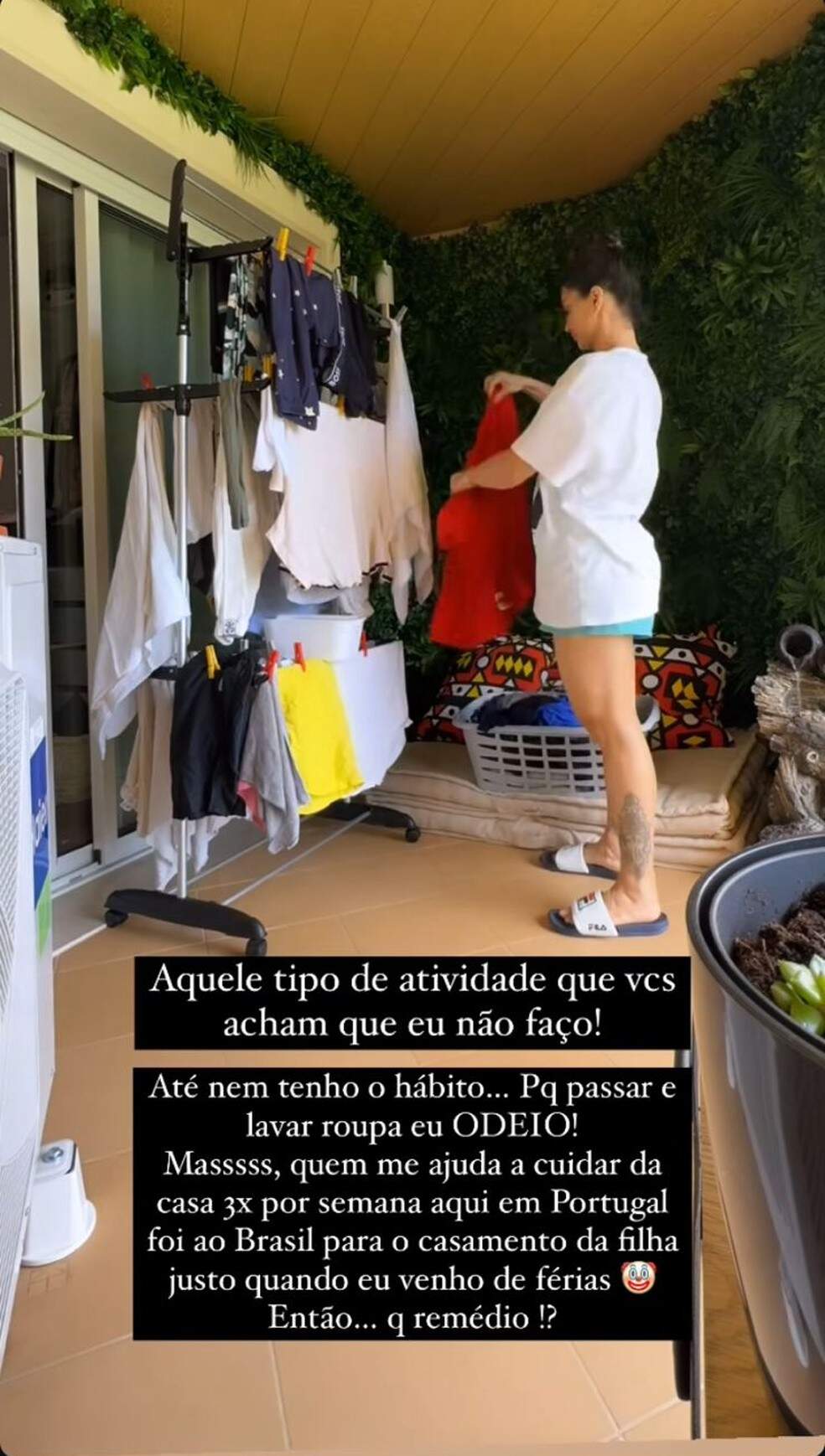 “Aquele tipo de atividade que vocês acham que eu não faço”, disse ela, admitindo que prefere realmente não fazer. “Nem tenho o hábito porque passar e lavar roupa, eu odeio!”, complementou, mostrando seu varal vertical cheio de peças.