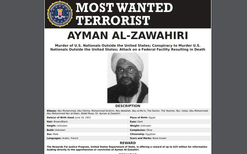 O órgão norte-americano oferecia uma recompensa de US$ 25 milhões – o equivalente a R$ 129 milhões. De acordo com as informações do FBI, Al-Zawahiri era médico e fundador da Jihad Islâmica Egípcia (EIJ). Aproximadamente em 1998, o EIJ liderado fundiu-se com a Al Qaeda.