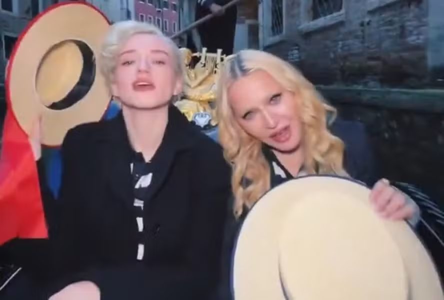 A dupla está em Veneza, na Itália, para as filmagens da segunda temporada de “O estúdio”, e aproveitou para recriar o clássico clipe de “Like a virgin”, lançado em 1984, e passado na cidade italiana.