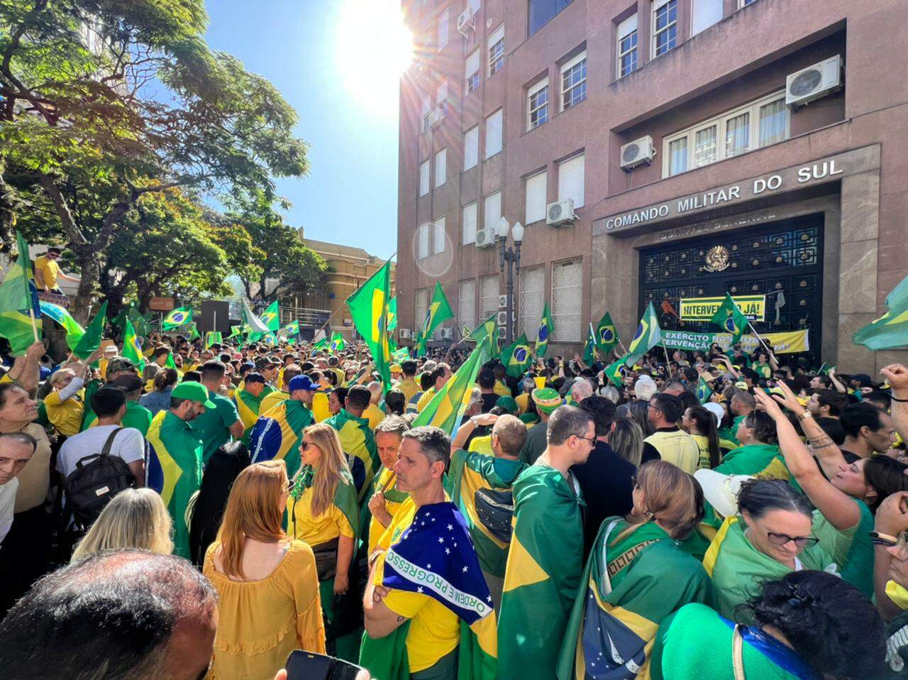 Manifestantes favoráveis ao presidente Jair Bolsonaro seguiram até o início da tarde desta quarta-feira (02), com atos pacíficos em frente a sede do CMS (Comando Militar do Sul), no Centro Histórico de Porto Alegre. Eles pedem intervenção militar.