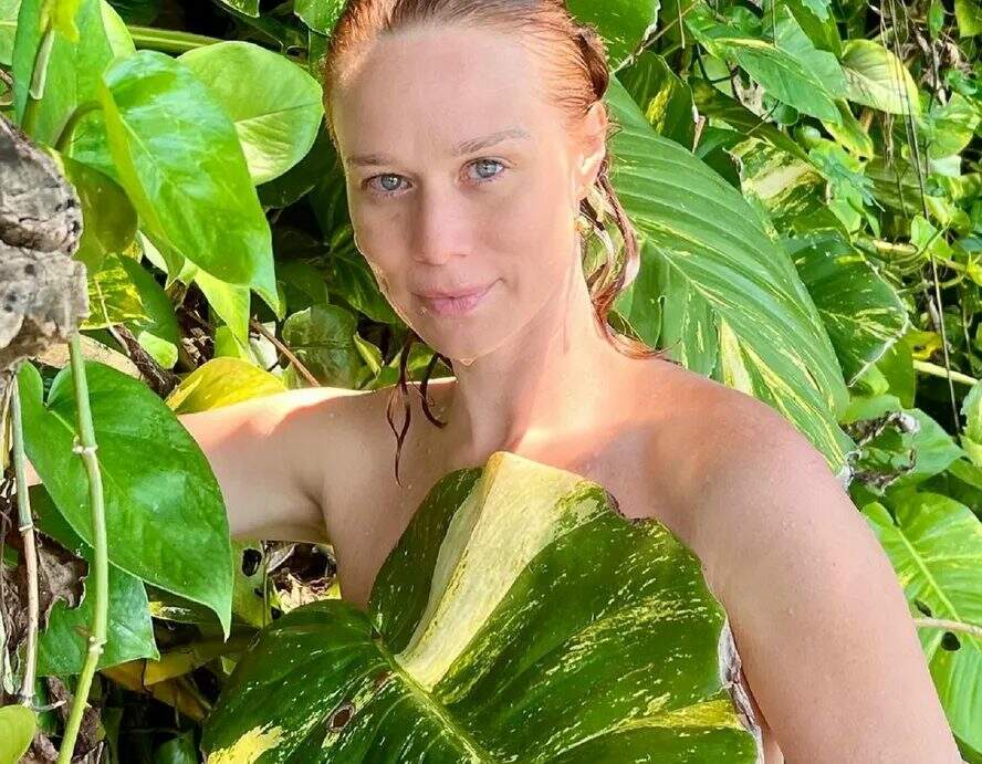 Em publicação no Instagram, a atriz de 42 anos apareceu de topless com os seios cobertos por uma folha e citou o clássico Luz do Sol, de Caetano Veloso.