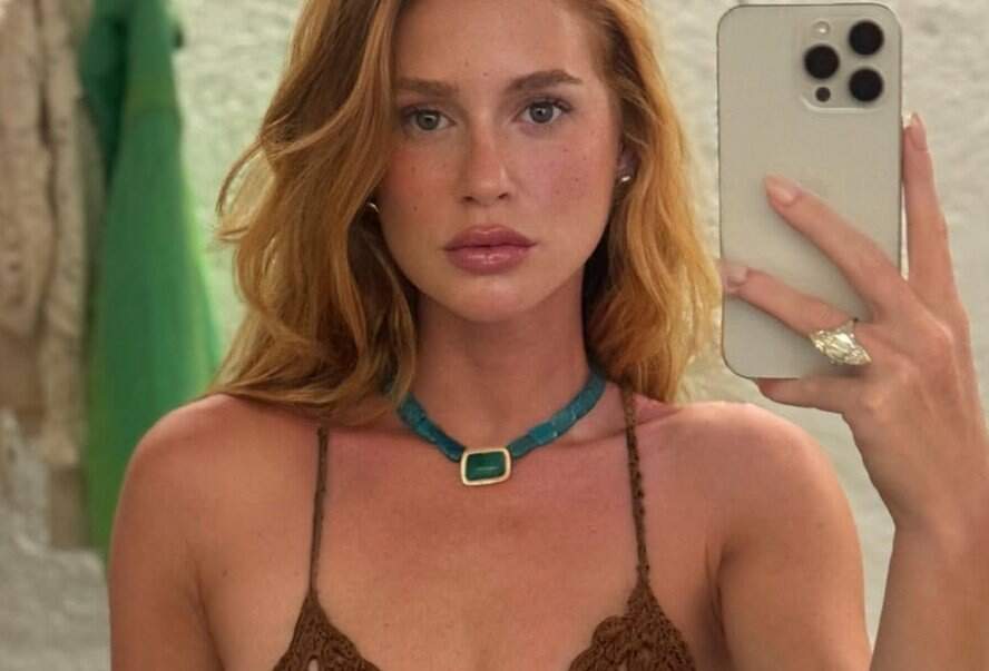Marina Ruy Barbosa mostra marquinha de biquíni em look com recorte na cintura