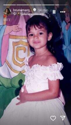 Marquezine republicou um story em seu Instagram na tarde desta segunda-feira (06) com uma foto sua criança usando um vestido branco semelhante ao que utilizou no baile organizado pela revista Vogue.