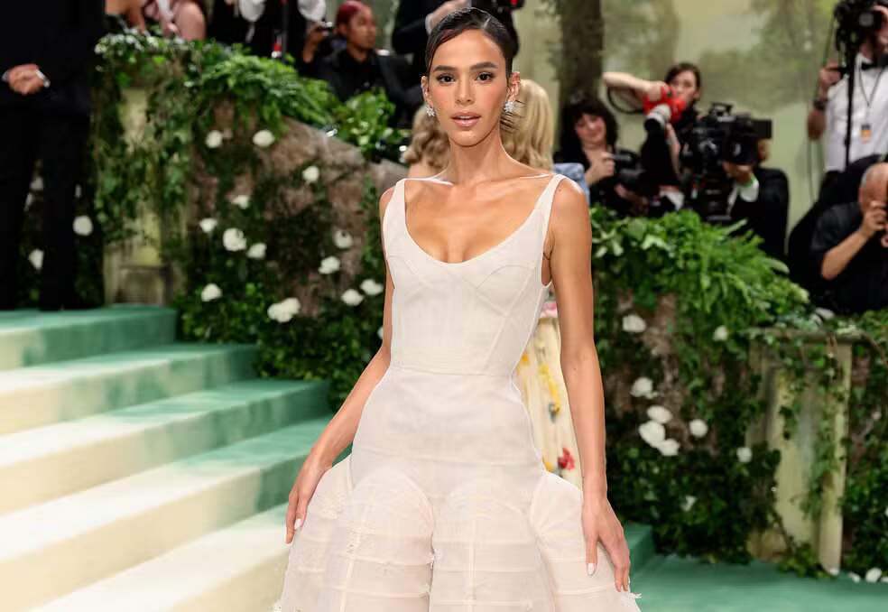 Bruna Marquezine fez sua primeira aparição no Met Gala 2024 usando um vestido branco com saia bufante e aplicações de flores na barra. A atriz brasileira apostou em um coque clássico, maquiagem leve e poucos acessórios, deixando o colo totalmente livre.
