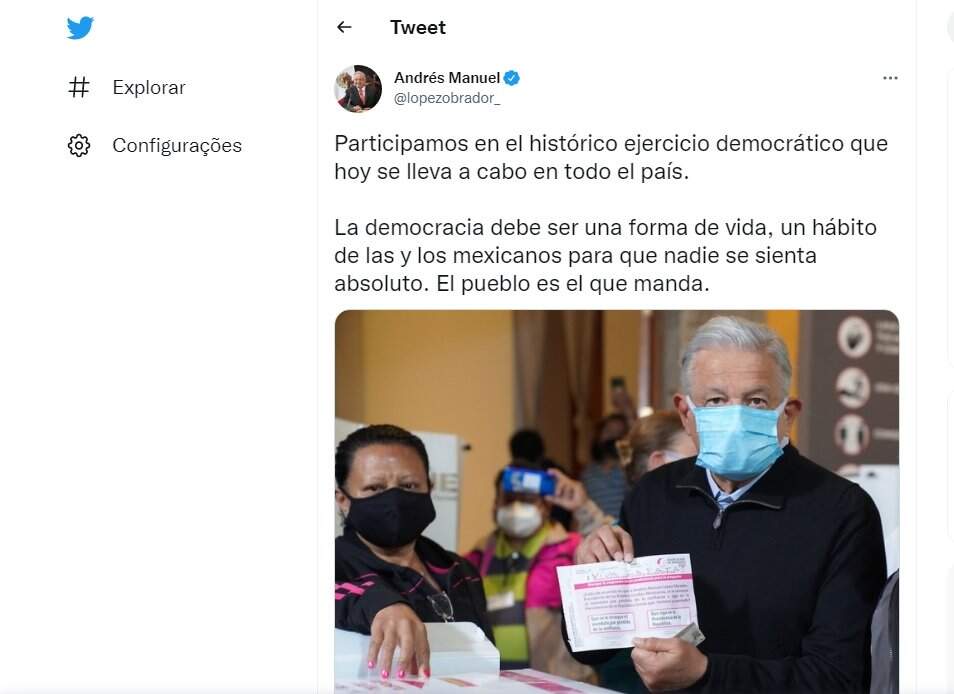 O presidente López Obrador já realizou seu voto e compartilhou uma foto em suas redes sociais. Na legenda, Obrador enaltece o exercício democrático.