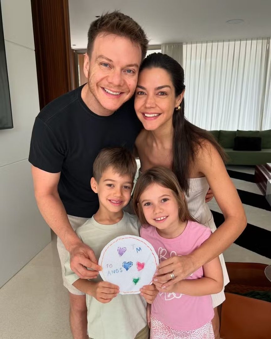 Por meio das redes sociais, o casal mostrou uma peça bordada pelos próprios filhos que comemorava a data. “10 anos, TM”, era o escrito, acompanhado de diversos corações em rosa, roxo, azul e verde.