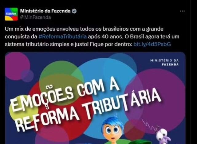 O Ministério da Fazenda entrou na “disputa dos memes” nas redes sociais e fez uma postagem no X com os personagens do franquia hollywoodiana Divertidamente 2 e um texto sobre a reforma tributária.