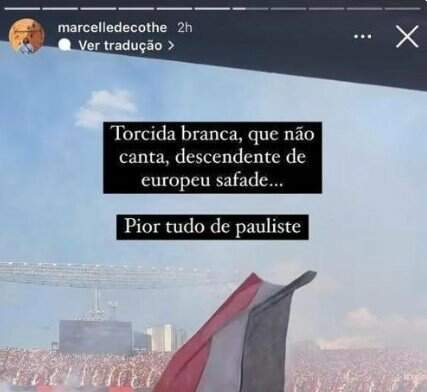 Em seu perfil no Instagram, Marcelle Decothé publicou um story (postagem temporária) com foto da torcida do São Paulo no estádio Morumbi.