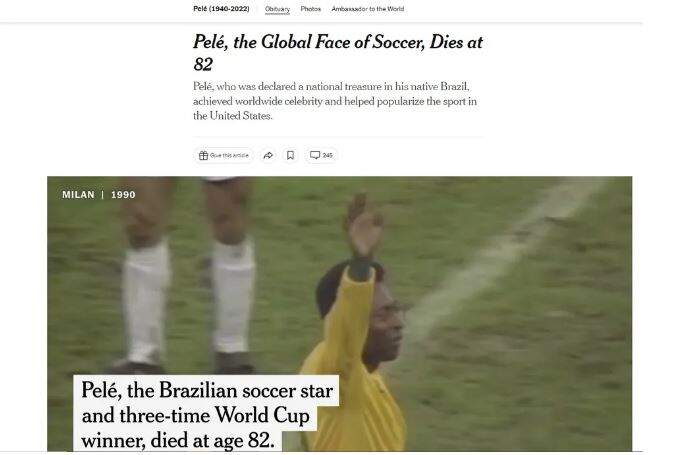 O jornal americano The New York Times descreve Pelé como “um dos maiores jogadores de futebol e uma figura transformadora no esporte do século 20, que alcançou um nível de celebridade global que poucos atletas conheceram”. Também chama o Rei de a “face global do futebol”.