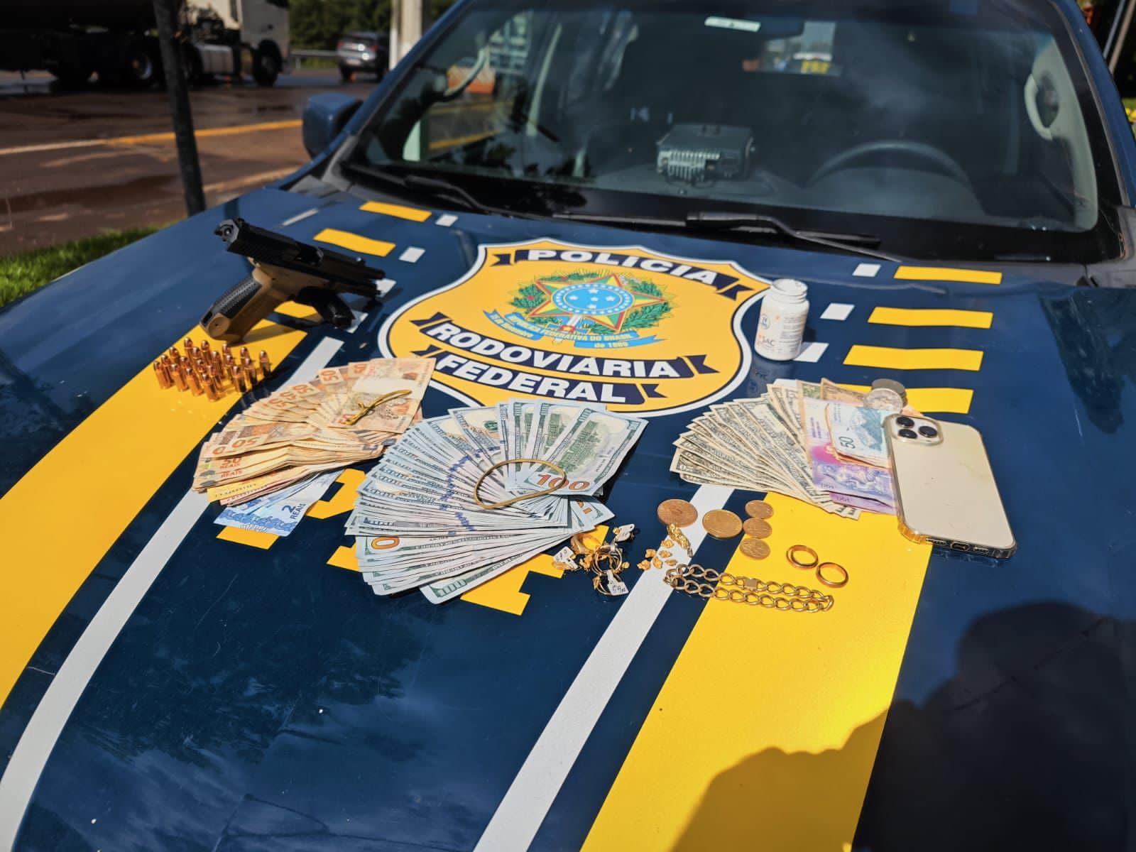 Em consulta aos sistemas, foi constatado que o motorista não possuía o registro da arma de fogo, e que ele já possuía passagens por outro delito de porte ilegal, além de algumas ocorrências de ameaça, inclusive contra agentes de segurança pública, o que motivou uma busca veicular mais apurada, quando os policiais acabaram encontrando, além da pistola, diversas pepitas de ouro, anéis de ouro e 4.882 dólares em espécie. O motorista não soube informar sobre os materiais e o dinheiro encontrados.