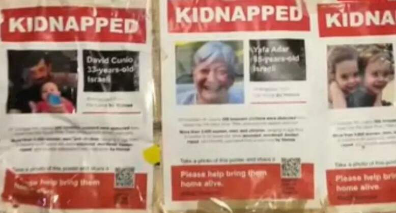 Em um muro foram colocadas imagens de algumas das pessoas levadas pelo grupo terrorista. Entre os que foram sequestrados estão Margalit, 78 anos; Emma e Julie, 3 anos; Amelia, 5 anos, e Ariel, 26; Chaim, 79 anos, e Aviv, 2 anos.