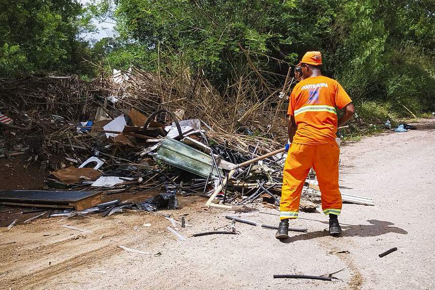 Uma equipe formada por quatro garis e um fiscal atuou no mutirão para a retirada dos pontos com acúmulo de sujeira na localidade. O trabalho contou com o auxílio de uma retroescavadeira e três caminhões.