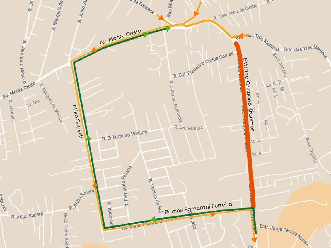 No sentido bairro-Centro, os veículos do transporte coletivo deverão seguir pela Estrada Cristiano Kraemer, rua Romeu Samarani, avenida Atílio Superti e rua Monte Cristo, com acesso até a rua Rodrigues da Fonseca. No sentido Centro-bairro, o desvio será realizado pela rua Monte Cristo, avenida Atílio Superti e rua Romeu Samarani, com retorno à Estrada Cristiano Kraemer.