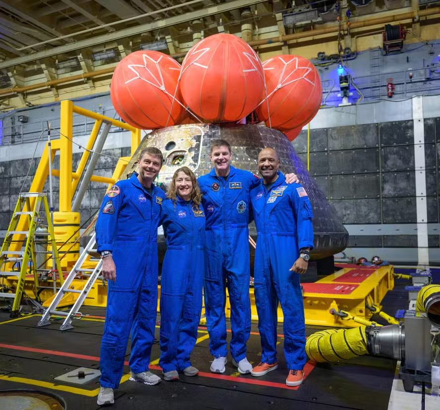 Nos registros, a cápsula Orion aparece equipada com os paraquedas utilizados na fase final da missão, responsáveis por desacelerar a nave antes do pouso no mar. O registro marca um dos primeiros momentos públicos da tripulação após a conclusão da viagem de dez dias.