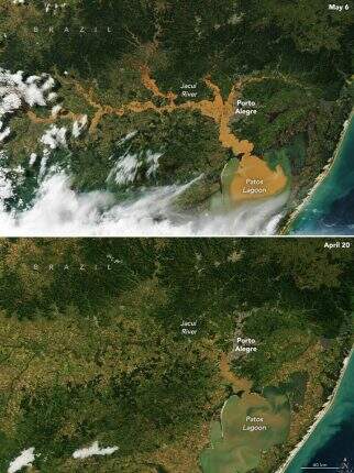 A Nasa, agência espacial ligada ao governo dos Estados Unidos, divulgou imagens captadas por satélite que mostram a dimensão da tragédia provocada pelas chuvas que atingem o Rio Grande do Sul desde a semana passada.