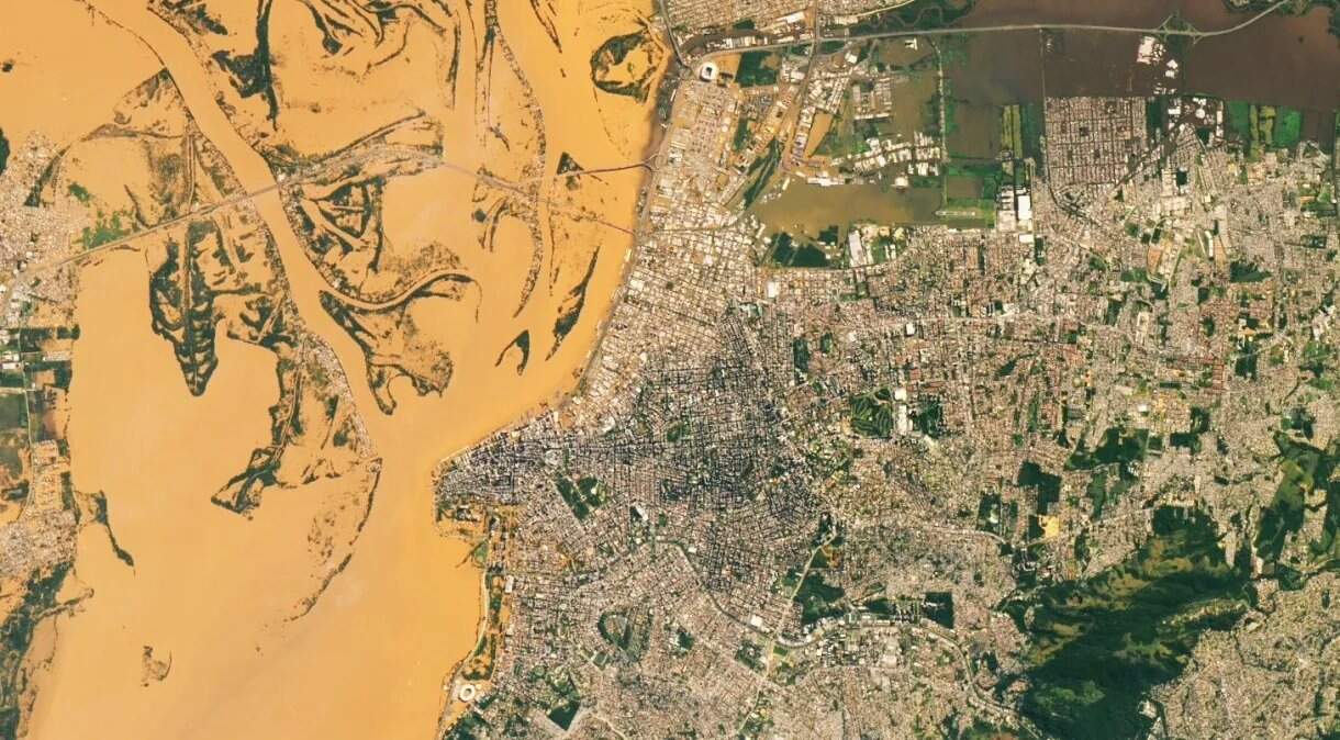 O transbordamento desses grandes rios provocaram grandes enchentes em municípios da região metropolitana. Além da capital gaúcha, as imagens de satélite mostram cidades como Canoas, Guaíba e Eldorado do Sul embaixo d’água.