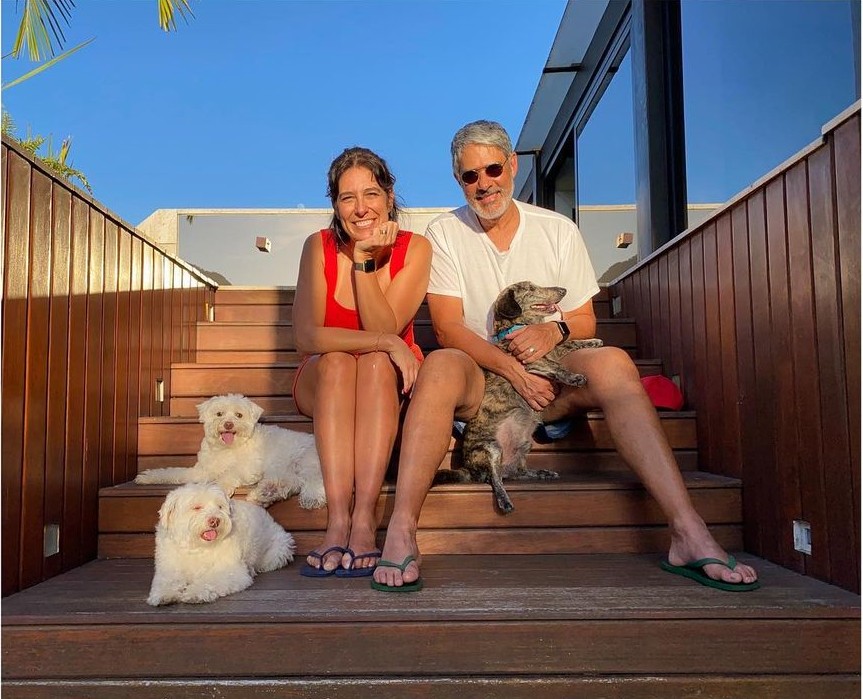 Natasha Dantas se derreteu toda ao compartilhar um clique ao lado de William Bonner e os três cachorros do casal. “Eu amo de verdade ver uma família diferente do usual. Que alegria ter uma assim”, vibrou na legenda.