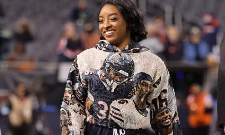 Simone Biles chamou atenção do público presente no estádio Soldier Field. A estrela da ginástica multicampeã foi até o local para acompanhar a partida do marido Jonathan Owens, defensor do Chicago Bears, e chamou atenção por utilizar uma roupa com o rosto do companheiro estampado.