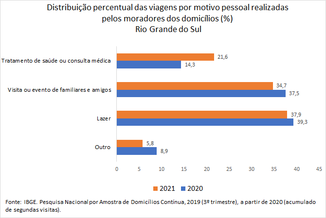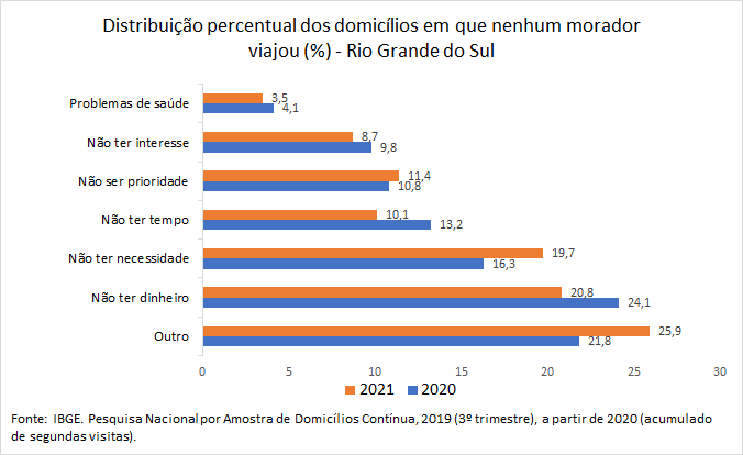 Em 2021, 85,2% dos domicílios gaúchos relataram que não houve viagem de nenhum de seus moradores nos últimos três meses. Um aumento de dez pontos percentuais em relação a 2019, último ano sem influência da pandemia de Covid-19, em que 75% dos domicílios declararam que nenhum morador havia viajado no período de referência. No ano de 2020, afetado pela pandemia a partir de março, foram 82,8% dos domicílios sem nenhuma viagem.