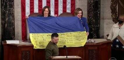 Em troca, a presidente da Câmara do EUA, Nancy Pelosi, deu a Zelensky uma bandeira dos Estados Unidos que sobrevoou o prédio do Capitólio na quarta-feira.