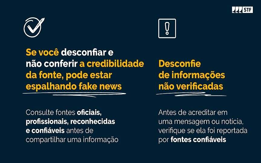 Em seis pontos, o STF reforça a importância de desconfiar de conteúdos compartilhados por fontes não confiáveis e recomenda a busca da informação em mais de um veículo de comunicação. Também pontua que é necessário ler todo o material e acreditar nas informações divulgadas por órgãos oficiais.