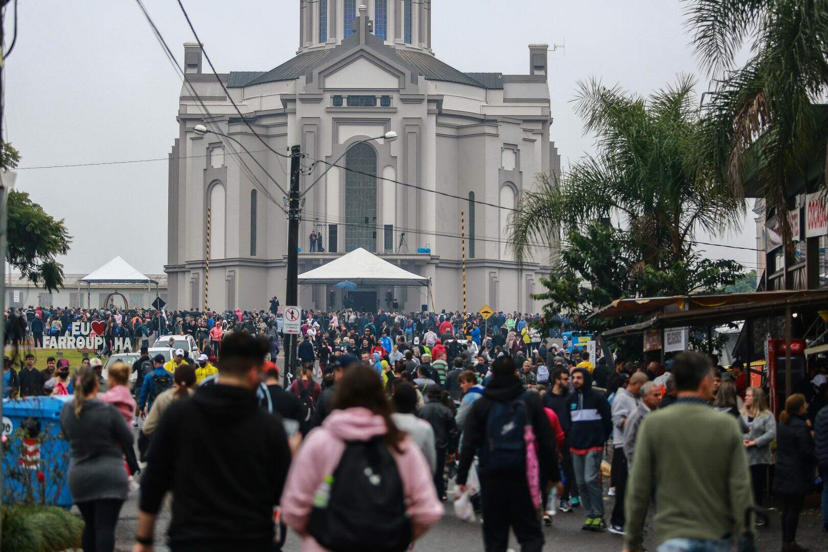 Ao longo desta quinta-feira (26), dia de Nossa Senhora de Caravaggio, mais de 65 mil fiéis participaram da 143ª Romaria ao Santuário de Caravaggio, em Farroupilha, na Serra, segundo a Brigada Militar, apesar da chuva da madrugada.