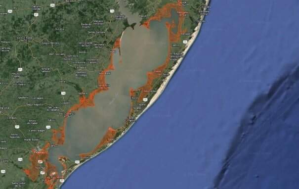 Pesquisadores do Instituto de Pesquisas Hidráulicas, da Universidade Federal do Rio Grande do Sul (UFRGS), fizeram um mapa das áreas que possivelmente serão atingidas por enchentes após a cheia na Lagoa dos Patos.