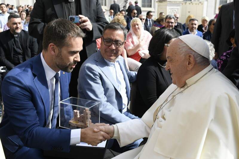 Na conversa com o pontífice, Leite presenteou o líder religioso com uma escultura das ruínas de São Miguel das Missões, além de camisas da Dupla Gre-Nal e do Brasil de Pelotas. A peça entregue ao papa foi esculpida por Regesmar Martins.