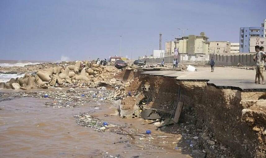 Uma enchente causada por uma tempestade atingiu o país no domingo à noite. Derna foi a mais atingida. Duas barragens romperam perto do núcleo urbano e as águas desceram por um vale que corta a cidade, levando pessoas, carros e prédios no caminho que termina no mar.
