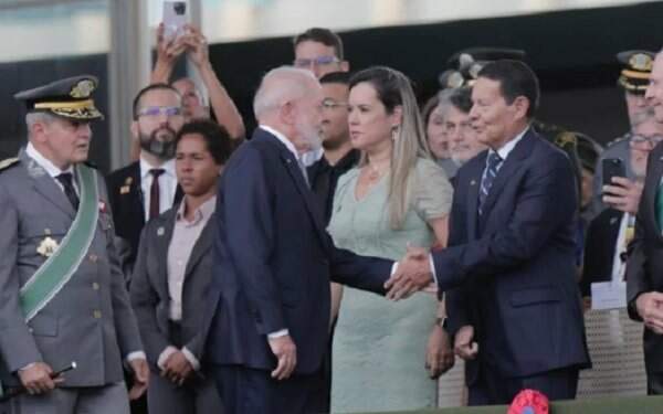 O presidente Luiz Inácio Lula da Silva (PT) cumprimentou nessa quarta-feira (16) o ex-vice-presidente do governo de Jair Bolsonaro (PL), Hamilton Mourão (Republicanos-RS). O aperto de mão com o general foi rápido e singelo.