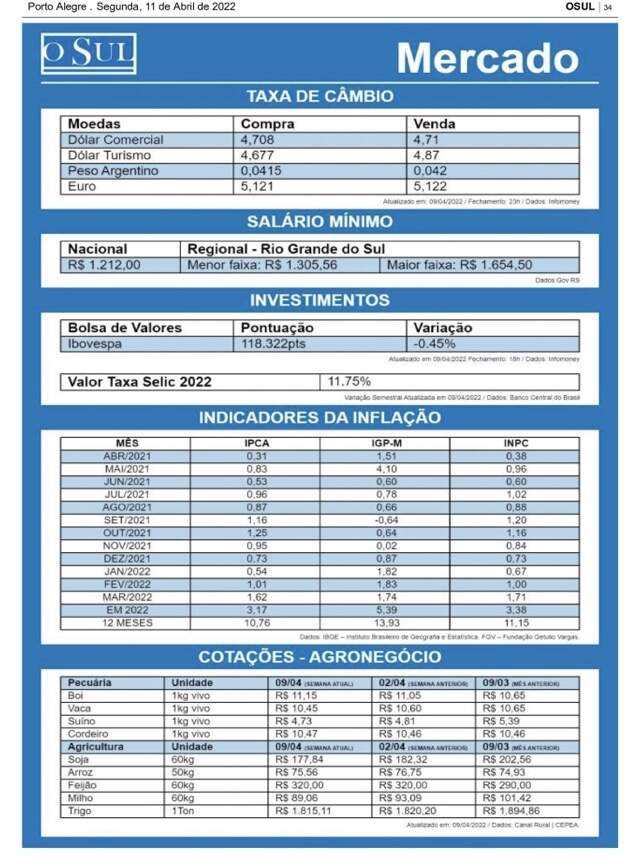 O jornal O Sul apresenta mais uma novidade para os seus leitores. Agora, os dados atualizados do mercado financeiro podem ser conferidos em tempo real no portal osul.com.br, na seção “Mercado”, no menu principal, e na edição on-line (disponível em Flip ou PDF), junto às principais notícias de economia.